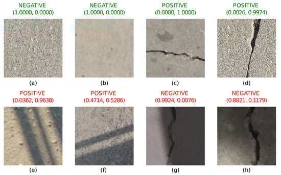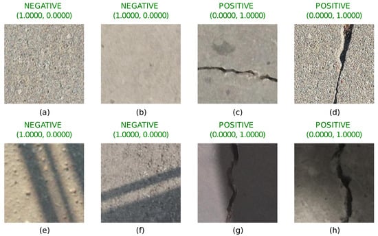 The results of the deep learning model are trained on the augmented Mendeley Concrete Crack Images for Classification data set (see Section 2.3), and then tested on a subset of test images. Testing of sample images taken in different scenarios are shown in Figure 7. Images without shadows are shown in Figure 7a–d. The accuracy of the model is perfect for both situations—images with and without cracks. The important factor is that the introduction of shadows in the training data set does not result in lower accuracy, and results are comparable with tests shown in Figure 3. Images with shadows and without cracks are shown in Figure 7e,f. Those images demonstrate that False-Positive cases of shadow patterns (that were incorrectly identified as cracks in Figure 3) are no longer present. Finally, images with shadows and cracks are shown in Figure 7g,h. Images with large shadow areas of high intensity are now identified correctly. This demonstrates that the classification using a network trained on the augmented images containing concrete surfaces with shadows results in accurate classification.