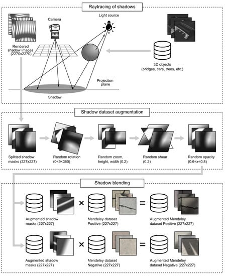 A schematic diagram for synthetic augmentation of complex shadow patterns—ray-tracing of shadows, shadow data set augmentation, and shadow blending.