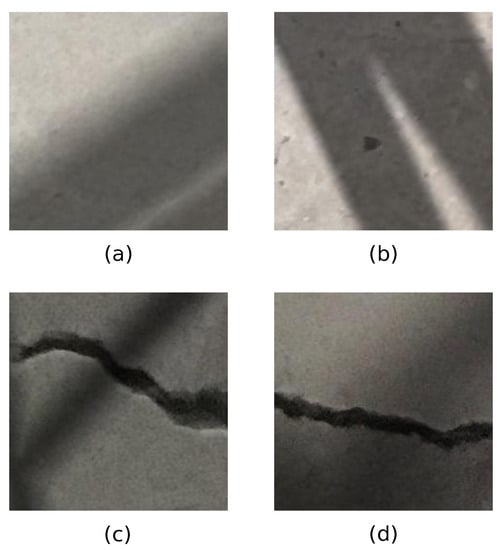 Some sample images are used to demonstrate crack detection challenges in the presence of shadows using existing deep-learning-based methods. For this purpose, we will use the published data set of concrete crack images from Ozgenel [26], which consists of 40,000 images of surfaces with and without concrete cracks. A set of sample images is shown in Figure 2. This database of images has been widely used by researchers for the training and testing of multiple deep learning models for concrete crack detection.