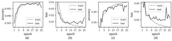 The training dynamics of the network: (a,b) depicts the accuracy and loss functions using the original data set; (c,d) correspond to the training dynamics of the network with the augmented data set.