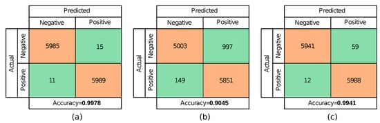 Confusion matrices showing different network accuracy in different scenarios are shown in Figure 8. First, a confusion matrix for a model trained and tested on the data sets without shadows is given in Figure 8a. The model achieves 0.9978 accuracy and is comparable with most state-of-the-art deep learning-based concrete crack identification models. Test results show 15 False-Positive and 11 False-Negative errors, which is totally acceptable for most applications. Next, a confusion matrix for a model which is trained on the original Mendeley Concrete Crack Images for Classification data set (same as in the previous case) but tested on concrete crack images containing complex shadows of varying intensity is shown in Figure 8b. A noticeable drop in accuracy (0.9045 compared to 0.9978 in the previous case) is observed. The larger part of this drop in accuracy is caused by False-Positive errors. In this case, shadows are incorrectly identified as cracks. Finally, a confusion matrix for a model trained on the augmented Mendeley Concrete Crack Images for Classification data set and tested on concrete crack images containing complex shadows of varying intensity is shown in Figure 8c. In this scenario, the accuracy returns to an acceptable level of 0.9941 and can be considered as a big improvement in comparison to Figure 8b. The presented results prove that the proposed approach based on the augmentation of the original data set with synthetically generated complex shadows proves to be beneficial for real-life applications which require high classification accuracy.
