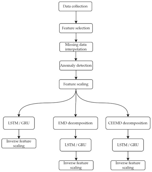 In order to improve the performance of the forecasting models, all available data will be preprocessed before been passed to the prediction tools to provide datasets that could be more easily forecasted. This process will be divided into two stages. In the first one, the time series representing those variables will be statistically treated to detect and correct anomalous data. They will then be scaled to provide the neural models with datasets that are easier to process. These treatments are a common practice in time series forecasting that aim at providing new versions of the datasets that could be more easily treated. In the second stage, an algorithm will decompose the statistically treated time series into a set of subseries with a more or less uniform periodic behavior. This process will be carried out by the EMD [55,56] or the CEEMD [58], or a modification of this. It is expected that these new subseries will be more easily processed by the LSTM and the GRU, so that more accurate predictions can be obtained. The predictions of those subseries will be subsequently added to obtain the consumption predictions (which must be rescaled to obtain their actual values). The combination of a neural network (LSTM or GRU) with a decomposition algorithm (EMD or CMD) defines the hybrid forecasting model proposed in this work.