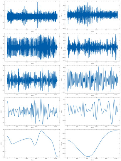 The last step in the preprocessing stage carried out in this work is the decomposition of the original time series into several subseries with a more or less periodical behavior that could be more easily forecasted. This process has been carried out by applying the Empirical Mode Decomposition (EMD) algorithm to the four time series. This algorithm automatically decomposes the time series into several stationary Intrinsic Mode Functions (IMF), whose number is determined by the algorithm itself. For the time series used in this work, 10 of such subseries were provided. They all are stationary as required by the algorithm. For the sake of comparison, a modified version of this algorithm has been also tested: the Complete Ensemble Empirical Mode Decomposition (CEEMD). It represents an optimization of a modification of the original EMD algorithm, the Ensemble Empirical Mode Decomposition (EEMD), which was originally proposed to avoid the presence of the same frequencies in different IMFs. They will be tested to determine whether this modification actually improves the prediction accuracy. The decomposition obtained with the CEEMD for one of the training subsets (from 10 July 2019 to 13 September 2020) of the consumption time series is presented in Figure 3 as an example.