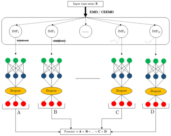 The forecasting model proposed in this work is made up of two stages: the first carries out a decomposition of the time series to be processed into a set of IMFs provided by the EMD or the CEEMD algorithms, while the second performs the forecasting process with an LSTM or a GRU neural model. This last process is independently applied to each one of the IMFs obtained. Therefore, there will be as many neural networks as IMFs provided by the EMD algorithm. The same neural model was used for all EMDs. Once all IMFs are processed, the predictions obtained will be added to obtain the corresponding consumption prediction. The structure of this forecasting model may be seen in Figure 4.