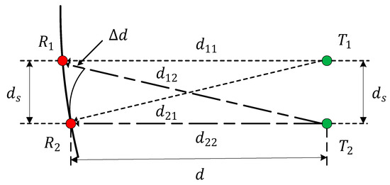 A 2 × 2 transceiver antenna array can be designed as a circular arc antenna array according to Equation (21), as shown in Figure 3.