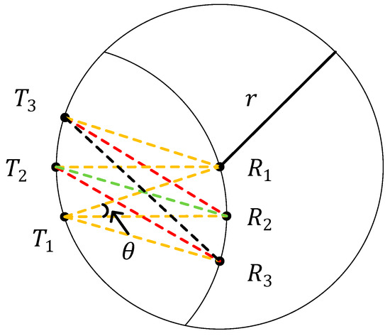 In Figure 5, , , and are transmitting antennas. , , and are receiving antennas. The antennas , , , and form a parallelogram. is the central angle of the circle with radius of , where is the distance between the transmitting and receiving antennas.