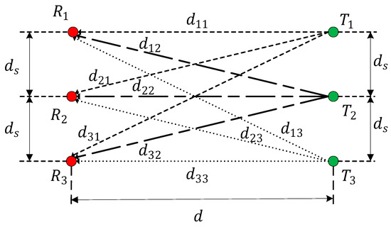 A 3 × 3 rectangular transceiver antenna array has a similar calculation method to the 2 × 2 ones. The rectangular transceiver antenna array is shown in Figure 6.