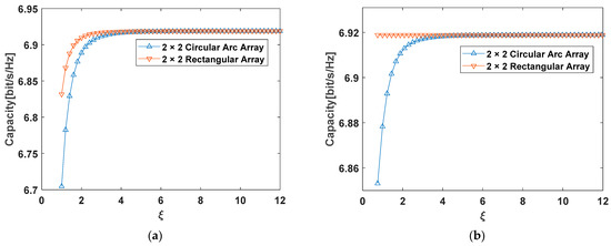 Channel capacity under two different 2 × 2 antenna configurations: (a) circular arc antenna array; (b) rectangular antenna array.