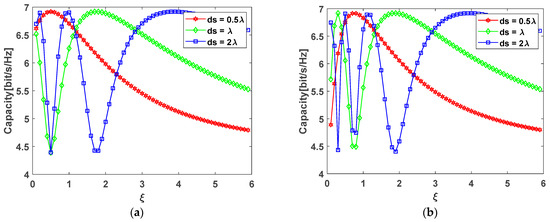 According to Figure 7a,b, when , whether it is an arc array or a rectangular array, they can reach the maximum capacity. There are differences between the two configurations when the aspect ratio is small, and they are basically the same when the aspect ratio is large, which means that the performance of the two configurations is similar when the distance between the transmitting and receiving antennas is large. The result of the research on the MIMO system can be calculated as in [43], which uses an approximation of the Taylor expansion in sub-channel propagation paths. This paper gives a more precise expression on the MIMO system, such errors cannot be ignored in short-distance transmission. However, the aspect ratio is approximately equal to in long-distance transmission, where is the ratio of array element spacing to wavelength .