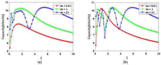 According to Equations (29) and (34), Table 2 gives the best value of the aspect ratio and array element spacing at the maximum channel capacity. Figure 8 shows the specific change trend.