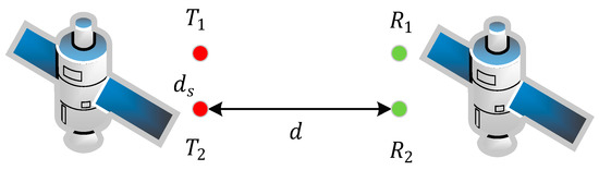 The above theory can be applied not only to short-distance LoS coupling train communication, but also to inter-satellite communication in a non-scattering LoS environment. In inter-satellite communication, the distance of transceiver antennas is relatively farther, which means that the aspect ratio is large. In order to ensure the proper spacing of the antenna elements, the signal transmission frequency needs to be increased. However, the frequency of satellite communication is primarily focused on the Ka frequency range (26–40 GHz) and frequencies will be higher in the future. The MIMO inter-satellite communication system is shown in Figure 12.