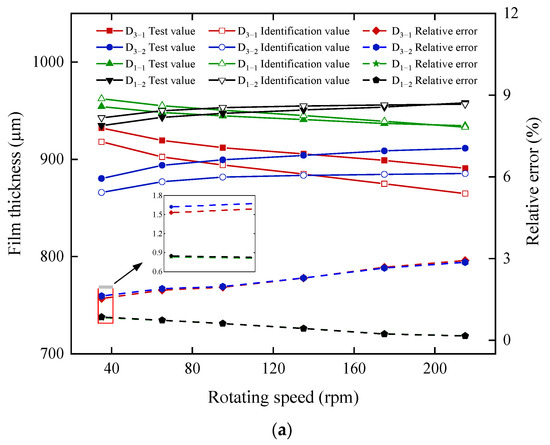 The identification method proposed in this study enables the identification of bearing circumferential film thickness using data from measurement points. Figure 7 compares the thickness of the test and identification film for six measurement points in two selected test sections. The data of sensors #1 and #2 in two test sections are shown in Figure 7a, the maximum relative errors corresponding with the four measurement points are 2.93%, 2.86%, 0.83%, and 0.85%, respectively. With the increase of speed, the relative error of section D1 decreases and the relative error of section D3 increases. The data of sensors #3 in two test sections are shown in Figure 7b, the maximum relative errors corresponding with the two measurement points are 6.87% and 4.04%. The above results show that the identification results well match the test results, and the trend of test-film thickness and identification-film thickness remains the same.