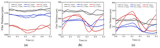 Film thickness-circumference distribution of test sections at different rotational speeds: (a) D1 section; (b) D2 section; and (c) D3 section.
