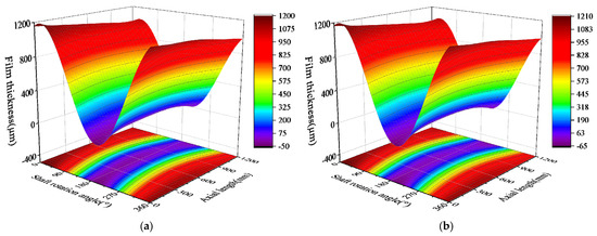 The minimum film thickness of each section is determined by calculating the three-dimensional film thickness data of the bearing. According to the film thickness identification method proposed in Section 3, to obtain the full-bearing film-thickness data, it is necessary to calculate the axis position data for each section. The axis position of the test sections can be accurately obtained, and the axis position of the non-test sections can be deduced by combining the shaft-bending curve. The shaft-bending curve was obtained by fitting the axial position data of the three test sections using the least-square method, and the film thickness data of the full bearing was deduced by combining the film thickness identification method. Figure 13 shows the three-dimensional film-thickness distribution at different speeds. From the film-thickness projection, it can be seen that the film-thickness contour is not parallel to the axis. The axis is clearly bent in the horizontal and vertical directions. However, there are negative values of film thickness at the beginning and end of the bearing, the reason may be that there are few test points, which makes it difficult to correctly reflect the real state of the shaft bending curve in the test-data fitting results.