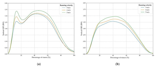 - Hamill, J.; Bates, B.T.; Knutzen, K.M.; Sawhill, J.A. Variations in ground reaction force parameters at different running speeds. Hum. Mov. Sci. 1983, 2, 47–56. [Google Scholar] [CrossRef]