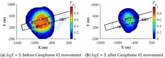 To investigate the variation characteristics of the detection probability of the seismic monitoring system induced by geophone movement, results for the seismic events with logE of 3, 4, and 5 one week before and after Geophone #2’s movement on 5 June 2014 were used for analysis, as shown in Figure 9. Figure 9a–d shows that the movement of Geophone #2 significantly weakened the capability of the seismic monitoring system to detect medium-low energy level events. For seismic events with logE = 3, the maximum was about 0.8 before the geophone movement (Figure 9a), which decreased to less than 0.5 after Geophone #2 was moved (Figure 9b). Similarly, for seismic events with logE = 4, high zones with values over 0.8 also decreased in size by half after Geophone #2 was moved (see Figure 9c,d). In contrast, geophone movement only causes minor impacts on high-energy level events. Figure 9e,f indicates that after moving Geophone #2, only the zone between Geophone #1 and #7 had a reduction for seismic events with logE = 5, and the maximum value decreased from 0.9 to 0.8. For seismic events with logE = 6, similar distributions were presented before and after geophone movement, which only showed limited differences outside the geophones enclosed zone (see Figure 9g,h). These results imply that geophone layout modification can lead to significant variations of the detection probability for the medium-low energy level events, but it may only have minor influences on detecting high-energy events.