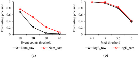 where TP denotes true positives, FP is false positives, and P means total positives. In this study, the precision for strong events forecasting was defined as the ratio of the number of > 5 seismic events above the event counts/energy threshold to the total number of > 5 seismic events. The recall for the forecasting of strong events was defined as the ratio of the number of grids with > 5 seismic events with the event counts/energy above the threshold to the total number of grids with event counts/energy above the threshold. The precision and recall results according to different event counts and energy thresholds are shown in Figure 14. Figure 14a shows that the > 5 events forecasting precision using () decreased with increasing threshold. The forecasting precision using ranged from 0.78 to 0.06 when the threshold changed from 10 to 40, which is higher than that using with values from 0.68 to 0.02. Compared to and in Figure 14a, and in Figure 14b achieved nearly identical precisions for the forecasting of > 5 events, which both ranged from 0.99 to 0.4 when the threshold changed from 4.5 to 6. In Figure 14c, significant differences are presented in > 5 events forecasting recall between using and . At an event counts threshold of 10, showed a better forecasting recall than , which were 0.19 and 0.14, respectively. However, at an event counts threshold of 20, the forecasting recall of increased to 0.21, whereas the forecasting recall of decreased to 0.12. At an event counts threshold of 30, the recall difference between using and increased to about 14%, representing 0.04 and 0.18, respectively. The forecasting recall of using significantly decreased to 0.05 at an event counts threshold of 40. In Figure 14d, and present nearly identical forecasting recall values from about 0.07 to 0.14, with the threshold ranging from 4.5 to 5.5. When the threshold reached 6, showed a higher forecasting recall than , which were 0.89 and 0.70, respectively. The results in Figure 14 demonstrate that by analysing event counts and seismic energy using compensated seismic data, the performance of forecasting strong seismic events in mines is further improved. Additionally, from Figure 14, a combination of the event counts and thresholds are recommended, which can provide a good method to forecast strong seismic events in mines with an acceptable precision and recall capability. At lower thresholds, event counts and both present good precisions, but the recall for is relatively low because of the large number of low events. At higher thresholds, there is a gain in the recall for , but the precision is reduced. Therefore, a good set of thresholds for forecasting strong seismic events could be that event counts equal to 20 and equal or better higher than 5.5.