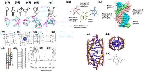 Upper left: Secondary structural elements and motifs found in nucleic acids including aptamers: (a1) stem-loop; (b1) internal loops; (c1) bulge; (d1) pseudo-knot; (e1) G-quadruplex [87]. Upper right: Triple-helix structures: (a2) the bases of the triplet of T–A*T are indicated by light blue, light green, and pink; (b2) the structure of Ts1 is depicted by the van der Waals model. First (5′-TTTTTTTCTTCT-3′), second (5′-AGAAGAAAAAAA-3′), and third (5′-TCTTCTTTTTTT-3′) strands are indicated by light blue, light green, and pink, respectively [88]. Lower left: The structure of (a3) G-quartet is formed by four guanines; (b3) the G-quartet is stabilized by chelating a cation (such as Na+, K+, or TI+). G4 structures are assembled with (c3) one, (d3) two, (e3) three, or (f3) four strands of DNA. Representative CD spectra of (g3) a parallel G4 and (h3) an antiparallel G4 structure. Reproduced with permission of Elsevier from ref. [89]. Lower right: C rich sequences can form i-motifs under acidic conditions: (a4) structure of the d(TC5) intermolecular i-motif (PDB ID: 225D); (b4) top view of d(TC5); (c4) a hemi-protonated cytosine–cytosine+ base pair. Reproduced with permission of Elsevier from ref. [90].