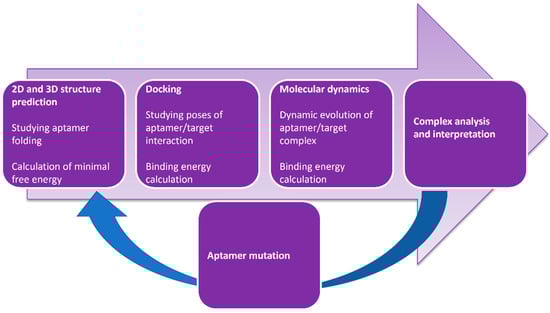 Schematic overview of a simulation-based workflow for the prediction of an aptamer’s structure and its interactions with its ligand. Through rational introduction of mutations or the use of genetic algorithms, the sequence of an aptamer can be altered, and a new round of simulation-based prediction of its improved affinity for its ligand can be undertaken [92].