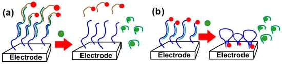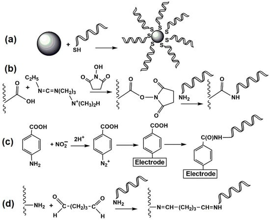 Aptamers are either covalently bonded or physically adsorbed on the electrode surface, together with some auxiliary components, such as mercaptohexanol that prevent the adsorption of the analyte to the naked gold surface. In addition to conventional immobilization protocols, based on which aptamers are directly deposited onto the sensor surface, hybridization of aptamers with already immobilized complementary DNA strands (so-called capture DNAs) has also been reported [135]. In some cases, such an immobilization strategy offers more opportunities for the generation of the signal toward analyte–aptamer binding. Appropriate examples are given below. Covalent binding of the aptamer is mostly achieved via terminal functional groups and is closely related to the nature of the underlying material. Thus, thiolated aptamers are immobilized on golden particles or bare Au electrodes via spontaneous formation of Au–S bonds [136,137], and aminated aptamers are covalently bonded to the carboxylated supports such as carbon nanomaterials [138]. Recently, electron grafting of the electrode with diazonium salt formed from p-aminophenylacetic acid or p-aminobenzoic acid has become popular [139]. In this method, the precursor compound is first treated with nitrite to form a diazonium salt, which is then electrodeposited on the electrode. Finally, carboxylic groups are involved in the reaction with carbodiimide to immobilize aminated aptamers.