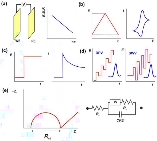 Electrochemical sensors used as transducers of aptasensors: (a) potentiometric cell: WE—working electrode, RE—reference electrode, V—voltmeter; (b) cyclic voltammetry; (c) amperometry; (d) differential pulse (DPV) and square wave (SWV) voltammetry. Red line illustrates the shape of current peak obtained; (e) electrochemical impedance spectroscopy; the Nyquist diagram and equivalent circuit correspond to the double-electric layer. Re is electrolyte resistance, Rct is charge transfer resistance, W is Warburg impedance, and CPE are constant phase element.