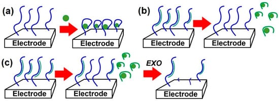To further improve LOD, the aptasensors based on Au nanoparticles obtained via electrodeposition on bare electrodes or carbon nanomaterials have been extensively employed [171]. Furthermore, the use of auxiliary DNA strands complementary to the aptamer can be immobilized onto the electrode and used for aptamer capturing through its hybridization with them. Recognition of an analyte by the aptamer results in signal increases, as the aptamer is released from the surface so that the density of the surfaced layer becomes lower (similar to the more conventional strand displacement protocols described below). Additional amplification has been demonstrated by treating the capturing DNA remained after the aptamer release with Recjf exonuclease that cleaves the DNA sequence and results in further decreases in the resistance of the charge transfer [264]. The opposite effect can be achieved by the reaction of auxiliary DNA with protein specifically bonded to single-stranded DNAs [245,263]. The indirect competitive assay is realized in [246]. In this study, the aptamer is first mixed with the analyte, and then the mixture is added to the electrode covered with a monolayer of auxiliary DNA complementary to free aptamer molecules. The hybridization product is then cleaved with an exonuclease, and changes in the permeability of the layer are controlled using EIS with [Fe(CN)6]3−/4−. Schemes of the aptamer-based monitoring of the permeability of the surface layer are presented in Figure 5.