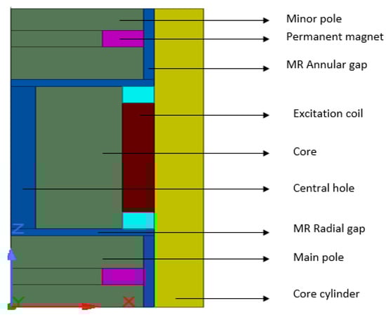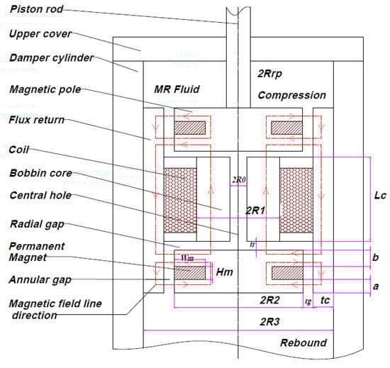 The initial magnetic field is supplied by the PMs, wherein the field generated from the bobbin core passes through the annular gap (lower or upper), continues to the magnetic core cylinder (flux return), and returns to the core to complete a magnetic circuit cycle. The field generated by the PM has a greater influence on the annular channel than on the radial channel. To enhance the magnetic field generated by the magnets, a positive/negative current is applied to the coil to generate the primary magnetic field. Unlike the field generated by the magnets, that from the coil can be gradually increased by varying the current input. Depending on the position of the PM poles, the magnetic field of the coil can cancel or strengthen the field induced by PM. The PM field from the magnets creates yield stress in the MR fluid around the annular channel, which prevents the model from acting as a passive damper in the case of electric failure. As is evident from Figure 1, as the piston is compressed, the MR fluid flows from the upper annular gap into the upper radial gap. The fluid from the upper radial gap passes through the central hole of the core to the lower radial and annular gaps. This process is repeated during the rebound process. In addition, according to [22] the MR fluid fills the space between the channels because of the pressure drop, which is controlled by the magnetic field of the PM and electromagnetic coil.