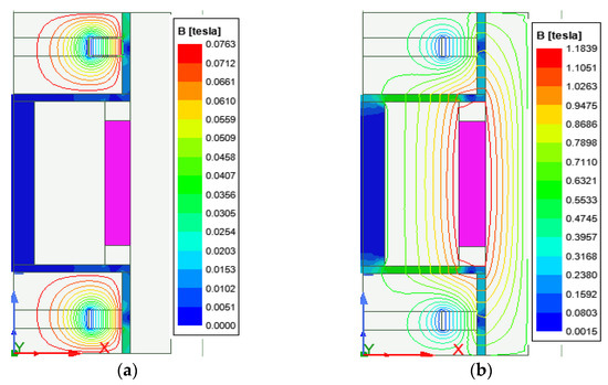 Distribution of magnetic field lines and flux density when: (a) only the PM is operating; (b) both the PM and coil are operating.