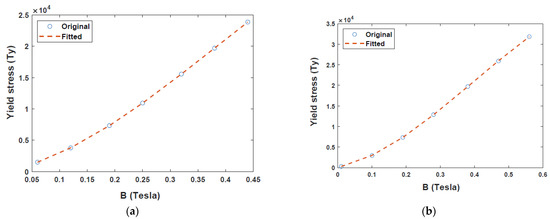 Unlike the magnetic field from the magnets, that from the coil, passes through both radial and annular directions and extends to the core cylinder to form a complete cycle, as shown in Figure 3a. After supplying a current of 1.5 A to the coil, the magnetic field densities generated for both radial and annular gaps were 0.56 T and 0.44 T, respectively. A typical magnetic field problem is described by defining its geometry, material properties, magnetic input, and boundary conditions. Based on the properties of MR fluid (MRF-132DG) [25] and FEM analysis results for electromagnetic characteristics shown in Figure 3, relationship between yield stress and magnetic field intensity can be obtained as presented in Figure 4. Figure 4a,b depict the relationship between magnetic flux density and yield stress in the annular and radial channels, respectively. The data points in Figure 4 were fitted into a polynomial curve using the least square method in MATLAB simulation software. Evidently, the radial channel generates a higher yield stress and magnetic field than the annular duct. The yield stresses in the two channels were deduced from Figure 4a,b as follows.