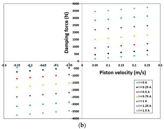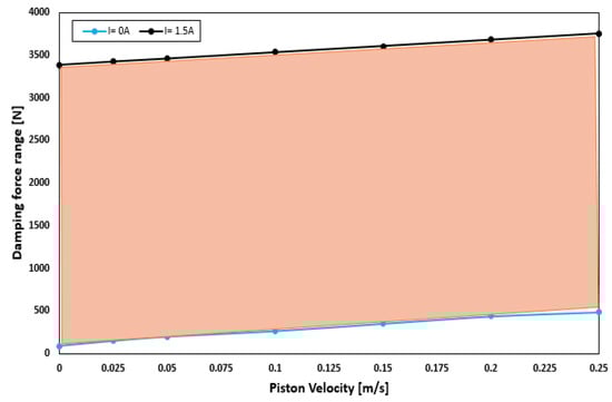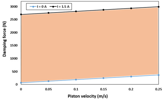 where and are the yield stresses in the annular and radial channels, respectively. To evaluate the performance of the proposed model, the damping force was calculated based on the equations in Section 3. Figure 5 shows the minimum damping force when no current is supplied to the coil (field-off condition) and the maximum damping force generated when the coil is excited (field-on condition). When the field is off (I = 0 A), a damping force of 70.507–365.98 N is generated for piston velocities of 0 and 0.25 m/s, respectively. By contrast, when the field is on (I = 1.5 A), the damping force increases from 2696.3 N to 2991.8 N for the same piston velocities. In addition, the highest dynamic range of 3.19 and 47.63 was obtained at a piston velocity of 0.05 m/s for field-off and field-on states, respectively. However, as the piston velocity increases, the dynamic range decreases significantly. For a constant speed of 0.25 m/s, dynamic ranges of 2.24 and 11.13 were obtained for the field-off and field-on states, respectively.