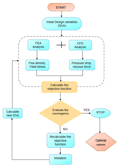 After obtaining the performance indices from the initial design parameters, a multi-objective genetic algorithm (MGA) is used to optimize the HARMRD. MGA is based on concepts from natural selection and genetics. It is commonly used to obtain high-quality solutions to search and optimization problems. The optimization process used in this study is depicted in Figure 6. During optimization, seven design variables (DVs) were selected based on their effects on the performance indices, including the damping force and dynamic range. The selected DVs are the piston radius , radius of circular disc , radius of the core from the central hole , coil width , piston radius , annular duct , and main pole . The upper and lower bounds of the design variables are listed in Table 2. In this study, the damping force and dynamic range were selected as the fitness functions. Ride comfort and suspension travel are two important factors in vehicle suspension design. To maintain the suspension travel short, a larger damping force is required, whereas to achieve better ride comfort, a low damping force and larger dynamic range are required. The fitness function is expressed as follows [26]:
