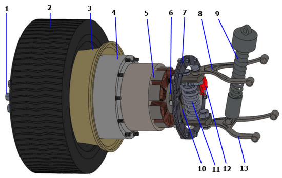 Physical structure of the HARMRD for electrical IWM suspension. 1. Nuts, 2. Tire, 3. Wheel, 4. Motor rotor, 5. Motor stator, 6. Hub shaft, 7. Brake disk, 8. Upper control arm, 9. HARMRD, 10. Hub, 11. DAV damper, 12. Brake caliper, 13. Lower control arm.