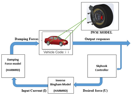 A co-simulation software (CarSim, V 9.0, Mechanical Simululation Corporation, Ann Arbor, MI, USA) was used to evaluate the effectiveness of the proposed HARMR model for an EV powered by an IWM. The CarSim interface is divided into three main parts: vehicle parameters and drive cycle, MATLAB/Simulink interface, and simulated results. CarSim is widely used to simulate the vehicle performance in terms of ride comfort, handling stability, and power. A D-class sedan with independent suspensions was used in the simulation. Figure 12 illustrates the simulation in MATLAB/Simulink in conjunction with CarSim. The damping forces (FD) supplied on each tire were considered as an external input to CarSim, and they were controlled by the Skyhook controller. In CarSim, the full vehicle parameters are specified based on a real vehicle. The considered parameters include the sprung mass, unsprung mass, wheelbase, vehicle width, and vehicle height. The parameters for the full vehicle are listed in Table 4. Five outputs were obtained from the sensor, namely force rate, body velocity, body deflection, tire deformation, and vertical acceleration. During the simulation, bump and random input roads were adopted from the CarSim software. The moving vehicle velocity for the bump and random road was fixed to 60 km/h. Here, a normal vehicle powered by an engine and an EV powered by an IWM were compared under the same road conditions. For simplicity, only the front-left suspension responses were considered for the full vehicle. For the riding test, a bump road input with amplitudes of 35 mm and 400 mm was used. A vehicle velocity of 60 km/h was used.