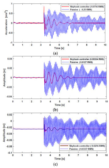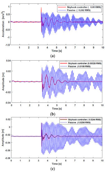 The vertical acceleration, suspension deflection, and tire deflection responses of a normal vehicle are shown in Figure 13. Two cases were investigated and compared during the simulation. First, the vehicle in CarSim was simulated without an external force, that is, passive suspension. Second, the external force from the HARMRD, controlled by the skyhook controller, was supplied to the vehicle. It is evident that the vehicle controlled by the proposed damper suppressed undesirable vibrations compared with the passive suspension. In addition, the proposed model exhibited a fast settling time after the vehicle hit the bump, which confirms the improvement in ride comfort achieved by the proposed model. To statistically verify the performance, the root mean square (RMS) for both the passive and controlled responses was calculated. The RMS values for passive responses decreased by 66.9%, 69.18%, and 18.12% for vertical acceleration, body deflection, and tire deflection, respectively. Figure 14 shows the time responses for a vehicle powered by IWM. Evidently, the proposed HARMD attenuates the vibrations for acceleration, suspension deflection, and tire deflection. The difference in responses between a vehicle powered by an engine and another powered by IWMs was insignificant. However, the RMS values for the IWM slightly increased compared with the RMS values for a normal vehicle. The passive RMS values for vertical acceleration, suspension deflection, and tire deflection reduced by 69.76%, 73.7%, and 24.03%, respectively.