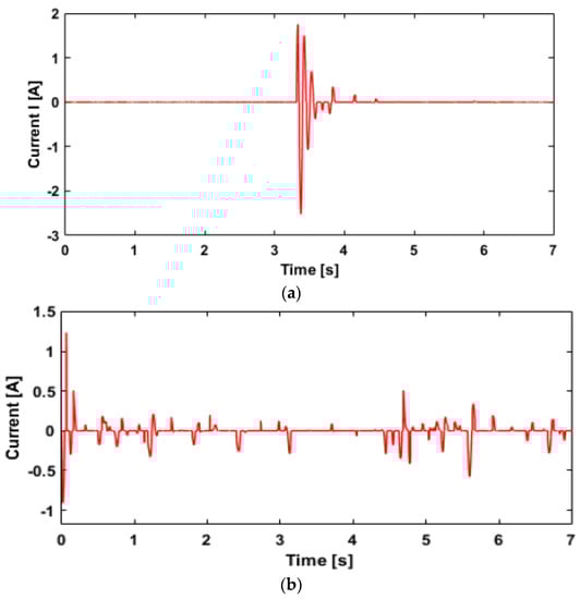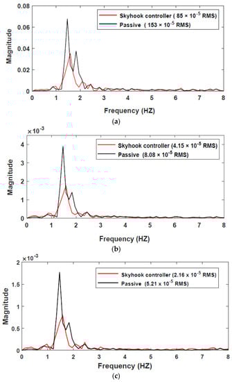 where represents the road profile, is the cut-off frequency, is the spatial frequency, is the assigned vehicle velocity selected as , is the road roughness coefficient, and is the random white noise. During the simulation, a skyhook controller was used to control the input damping force of each tire. The time responses from the random road are not clear to interpret because of the noise; therefore, the frequency responses obtained from the time domain were used to compare controlled and passive responses. Figure 15 shows the frequency responses of a vehicle powered by the IWM. The simulation results indicated that the controlled responses outperformed the passive responses in terms of dissipating energy generated from road unevenness. In addition, all the first peak resonances were in the vicinity of frequencies (1–2 Hz). According to ISO 2631 [32], maximum sensitive vibration to the human body ranges from (4–8 Hz). The RMS values of the body vertical acceleration, suspension deflection, and tire deflection confirm that the proposed damper model has a significant impact on lowering the RMS values compared with the passive values. The power supplied to the semi-active HARMR damper for both bumpy and random road input is illustrated in Figure 16a,b, respectively. Evidently, the proposed model is efficiently able to suppress the vibration for both bumpy and random roads with the generated current of about 1.7 A and 1.2 A, respectively.