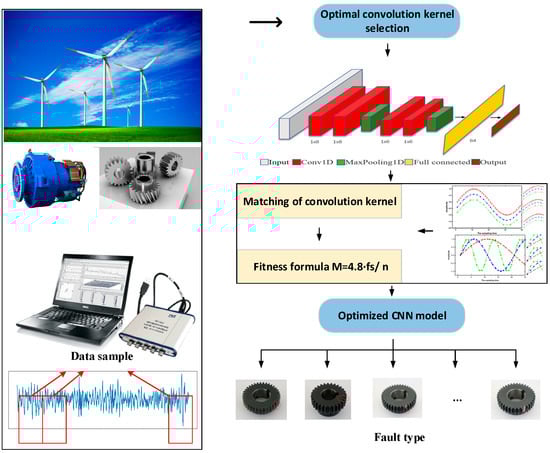 On the other hand, people have proposed better neural network structures, such as MACNN (multi-scale attention convolution neural network) [], improved MSCNN (multi-level attention convolution neural network) [], DNCNN (depth normalized convolution neural network) [], and FTNN (feature-based transmission neural network) []. These models have high recognition accuracy. To further improve the recognition efficiency of the model, how to further optimize the parameters of the above model is worth considering. The authors of [] summarized the traditional parameter optimization problems of the deep learning model but did not discuss the relationship between specific equipment parameters and model parameter optimization. To solve the above problems, this paper uses one-dimensional CNN to extract the features of one-dimensional signals directly. On the premise of not increasing the depth of CNN, the matching problem between convolution kernel size and signal (rotation speed and sampling frequency) is optimized and the optimal matching relationship between them is obtained, which is verified by experiments. Finally, the ability of CNN to extract vibration features is improved. The research process of this paper is shown in Figure 1. The red box in the lower left indicates that the original signal collected by the equipment is divided to form a data set: