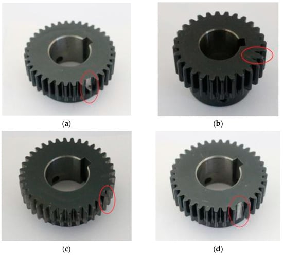 Faulty gear: (a) broken gear tooth; (b) gear crack; (c) gear wear and tear; (d) gear tooth deficiency.