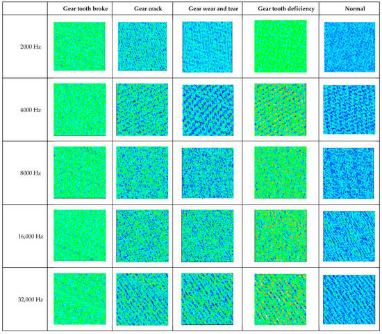 After continuous convolution and pooling operation, signals in different states are extracted into their own abstract feature maps in front of the full connection layer. The more obvious their visual differences, the higher the classification accuracy. It can be seen from Figure 5 that different faults have different fault characteristics and the fault characteristics become more complex with the increase in sampling frequency. Meanwhile, with the increase in sampling frequency, the fault differentiation degree of gear crack, normal and gear wear, and tear fault gradually decrease. This is because the change in signal sampling frequency will result in a decrease in the matching between the signal and the convolution kernel, which makes it impossible for CNN to obtain fault features with a large degree of differentiation by using the local perception field. As a result, it is difficult for CNN to distinguish gear crack, normal and gear wear, and tear feature information. Thus, the recognition rate is greatly reduced.