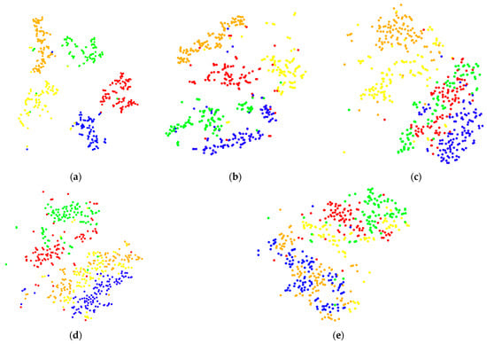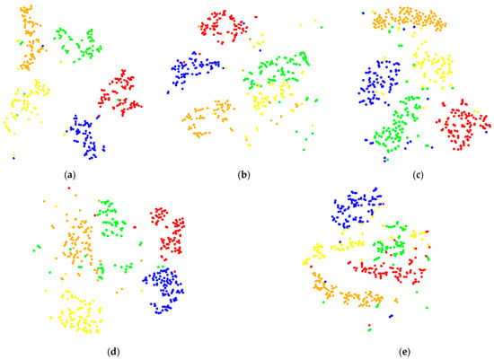 t-SNE image of signal classification in the fully connected layer: (a) 2000 Hz, (b) 4000 Hz, (c) 8000 Hz, (d) 16,000 Hz, and (e) 32,000 Hz.