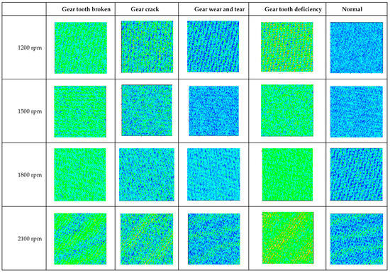 In order to further verify the matching between the signal and the optimal sensing field model, experiments of different motor speeds were carried out to further prove the reliability of the experiments. Similarly, the gear power transmission fault simulation test-bed of North China Electric Power University (Baoding, China) was used to obtain the vibration data of each fault type at 1200, 1500, 1800, and 2100 rpm by changing the motor speed. The sampling frequency was 2000 Hz. To ensure consistency, the training set/test set was divided by 3/1 in the same proportion as Table 2.