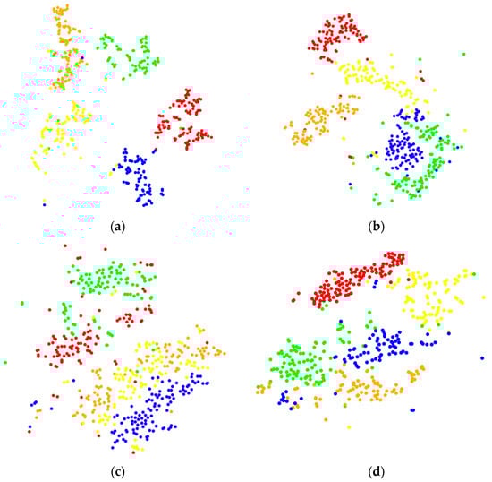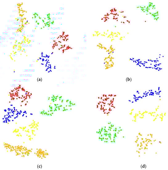 t-SNE image of signal classification in the fully connected layer: (a) 1200 rpm–2000 Hz, (b) 1500 rpm–2500 Hz, (c) 1800 rpm–3000 Hz, and (d) 2100 rpm–3500 Hz.