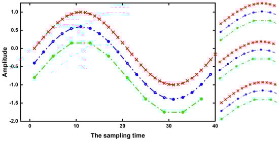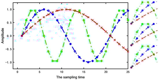 The left half of Figure 9 depicts the vibration signals with different sampling frequencies. The sampling frequency of the red curve is the highest, followed by the blue curve and the sampling frequency of the green curve is the lowest. The right half represents the local perception field of the same convolution kernel corresponding to different sampling frequencies. Four points on the green, blue, and red curves can be observed from top to bottom. As can be seen from Figure 9, with the increase in sampling frequency, the local perception range of the same convolution kernel scale decreases. On the contrary, if we want to have the same size of local sensing range, the sampling frequency will increase and the convolution kernel scale will also increase accordingly. It can be concluded that the scale of the convolution kernel should be proportional to the sampling frequency (m ∞ fs).