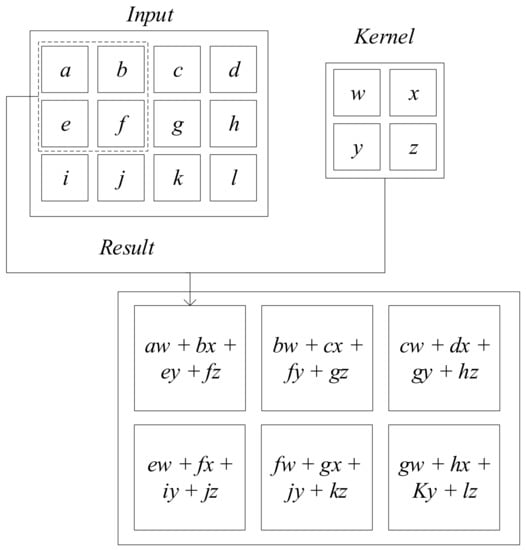 where i and j are the element positioning indexes of the resultant array S. w and h are the width and height indexes of kernel K, respectively. b is a constant bias term. The graphic explanation is shown in Figure 1. The elements of a single kernel are identical for the entire input domain, which enhances the parameter-sharing effect and reduces the total parameter number compared with the densely connected layers.