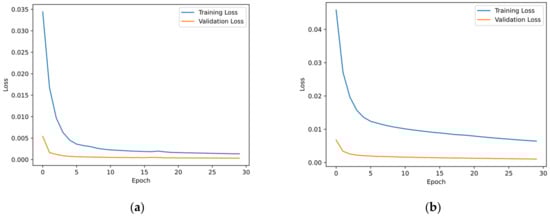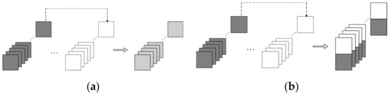 The skip connection is especially beneficial in an autoencoder structure because the low-level (short-period) information cannot all be retained in the bottleneck layer. A skip connection can help the decoder to utilize the encoder-extracted information, rather than only the bottleneck layer-retained information, when predicting the target outputs. The shallow layers’ output can skippingly propagate to the deeper layers in two modes: the adding or concatenating modes. The adding skip connection (see Figure 3a) sums the resultant tensors of two layers up, which requires the tensor shapes to be identical. The concatenating skip connection stacks the output tensors from two layers to form an extended tensor (see Figure 3b). In this paper, the adding skip was adopted as it can better “merge” the data and keep the tensor shape unchanged.