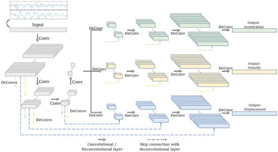 In the decoder, the extracted latent variables are gradually transformed into three types of responses: acceleration, velocity, and displacement. The network in Figure 4 has three branches that individually correspond to three response types, and there are no connections among the three branches. Take the branch for reconstructing the acceleration as an example. It has four deconvolutional layers that convert the latent variables in the bottleneck to the target. There are also skip connections containing both a deconvolutional layer and an adding layer, which convert the encoder-extracted patterns to the target responses. Skip connections provide the completeness of the information. The decoder branches for reconstructing the velocity and displacement have identical architectures and are not detailed again.