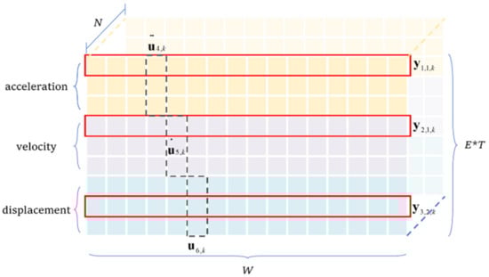 Figure 5 shows the output data structure of one training sample. The rows correspond to y and in Equation (11). The columns are the acceleration, velocity, and displacement vectors at each sampling moment in Equation (12).