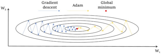 Figure 6 illustrates an intuitive explanation of Adam, where only two parameters W1 and W2 are considered. The gradient in the W1 direction is gentle while that in W2 is steep. One wants to accelerate the descending speed in W1 but slow down that in W2, without any prior information about their gradient distribution, and cannot assign varied learning rates in these two directions. The Adam optimizer achieves this aim using Equations (15) and (16). The decaying rate retains the former descending trend: the moving direction in W1 is consistent in the whole training process, and such a moving trend is well-retained; moving in the W2 direction is unstable, and Adam stabilizes it by considering the former moving trend with . The other metric of the Adam optimizer is the square and root-square operators over gradient g in Equations (15) and (16). The gradient in W1 direction is minor, and the corresponding term is greater to accelerate the descending speed. The function of is opposite in the W2 direction. In summary, the Adam adopts two strategies simultaneously to accelerate and stabilize the gradient descending process, and it is a superior methodology.