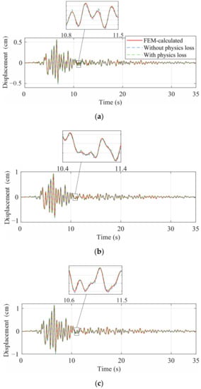 Since the nonlinear model is difficult to determine in real applications, the residual force in Equation (9) is unknown in most cases. Notably, if the introduced physics constraint is errored, it can even negatively affect the network’s training process. How to introduce prior physical knowledge into the network in nonlinear situations is still an open problem worthy of further studies. Nevertheless, if the adopted network model itself does not apply to the nonlinear situation, the physics loss becomes meaningless. Thus, we removed the physical loss and only trained the network with the empirical MSE loss in this section to further validate the feasibility and fitting ability of the origin network model as the basis for further introduction of any physics constraints.
