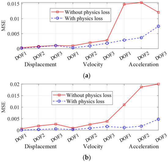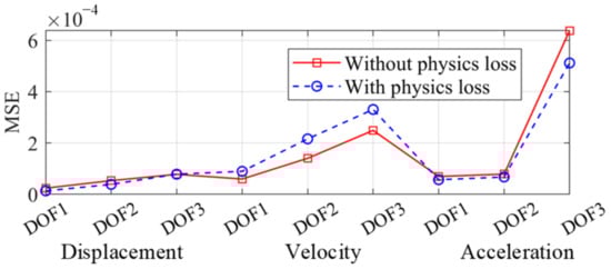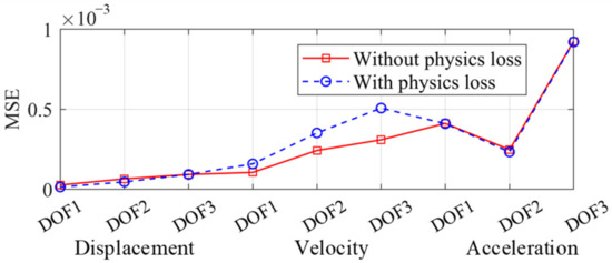In this section, the training and testing sets are similar to the former sets. We added 10% root mean square Gaussian white noise to the input and output data when training, which made the network-learned mapping relationship overfitted. In the testing set, the network input data were noisy as well, and the ground truth was noise-free to compare with the predictions. Figure 17 shows the MSE of the reconstructed responses with and without the physical loss. The PINN-estimated responses were more accurate at all DOFs, especially for the displacements and accelerations. Therefore, adding a physical loss term into the loss function could significantly improve the NN’s robustness to measurement noise.