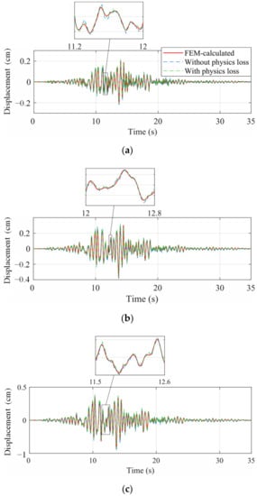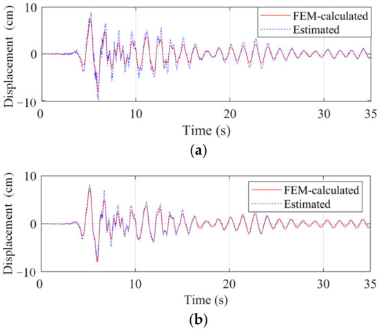 The training set was the nonlinear seismic responses under the first sixth seismic waves in Table 2. The test set contained the nonlinear responses under the Landers and Kocaeli waves. The amplitudes of the seismic waves were adjusted to provide that the maximum displacement of the base floor can exceed 2 cm to trigger the nonlinearity. The reconstructed displacement (under the Kocaeli wave) at the base floor is shown in Figure 19.